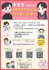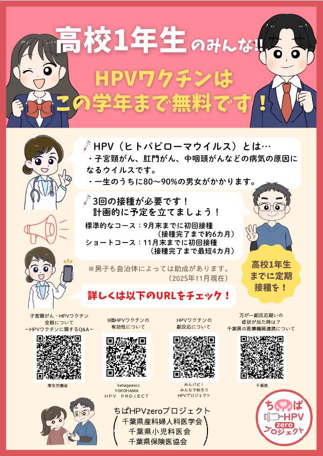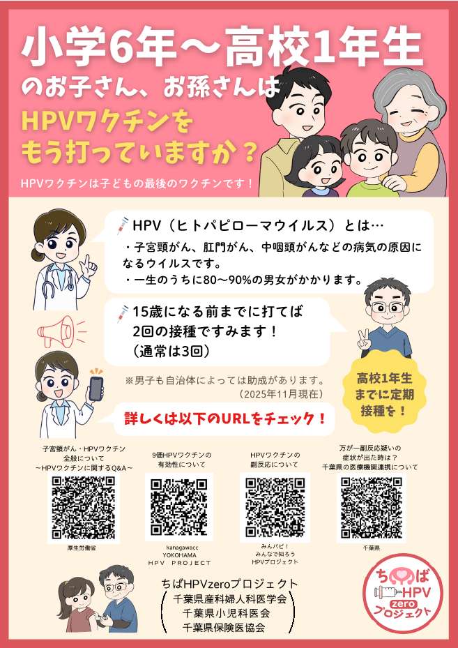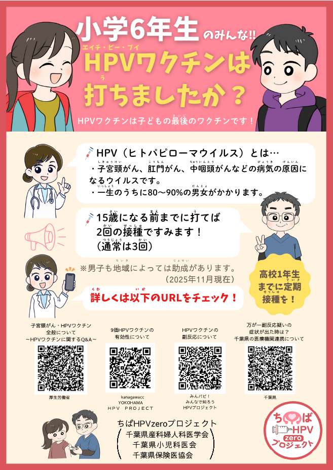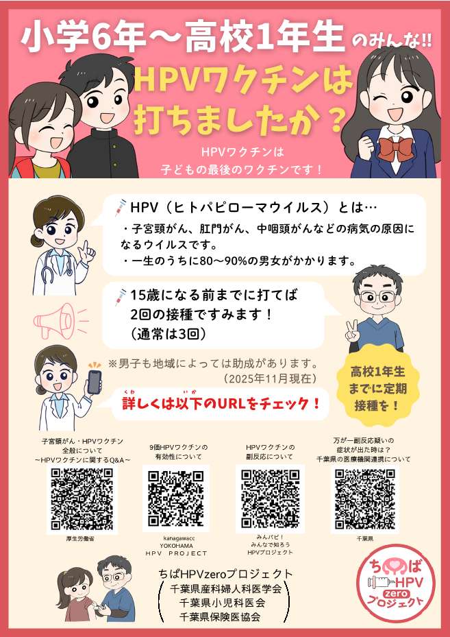 ★「ちばHPV zero プロジェクト」からのお知らせ 2025年12月24日お知らせ 千葉県産科婦人科医学会では、「ちばHPV zero プロジェクト」を立ち上げ、下記各種ポスター等を 作成しましたが、この度、デザイン等を刷新いたしましたので、それぞれダウンロードの上、 施設でのご掲示等でご利用下さい。 【定期接種用】 【小学6年~高校1年】 【小学生用】 【高校生用】 【中学生用】 【ロゴ(背景透明)】 【ロゴ(背景白)】 前ページへ戻る