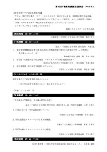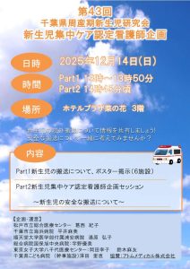 | 講演 | 1.一般演題:3題 2.シンポジウム:新生児集中ケア認定看護師企画セッション ~新生児の安全な搬送について一緒に考えませんか?~ 3.教育講演「先天疾患の早期発見、その後の管理と治療」千葉県こども病院より (1)「当院における口唇口蓋裂治療について」 (2)「新生児聴覚スクリ-ニングと先天性難聴」 (3)「胎児心臓スクリ-ニングシステムの構築」 |